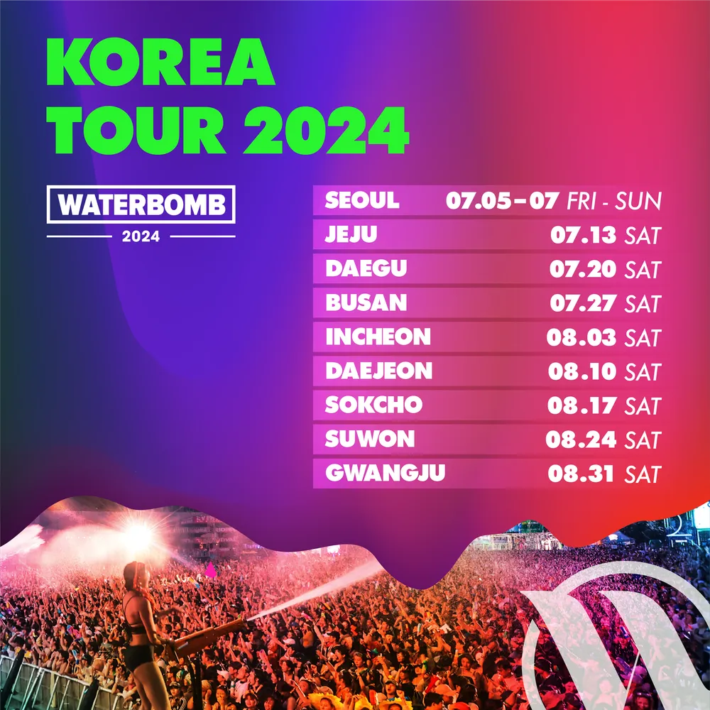 2024년 워터밤은 9개 도시에서 개최될 예정입니다. 일정은 다음과 같습니다: