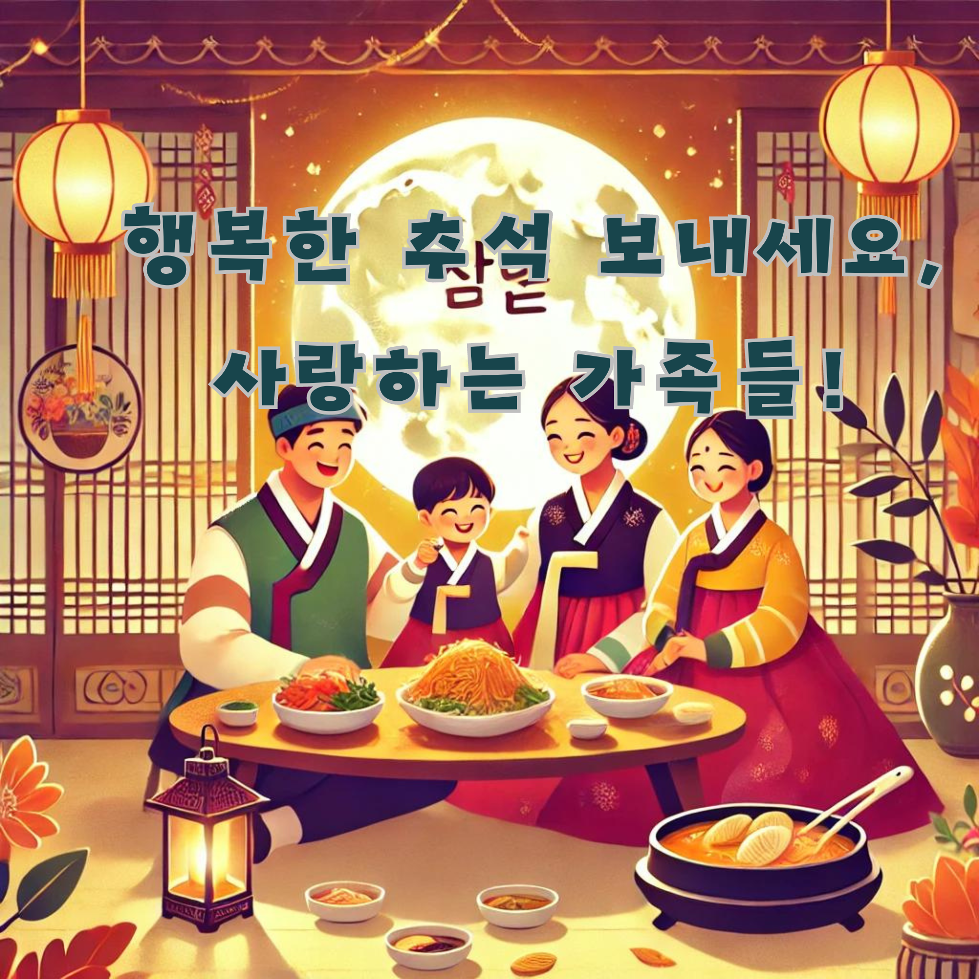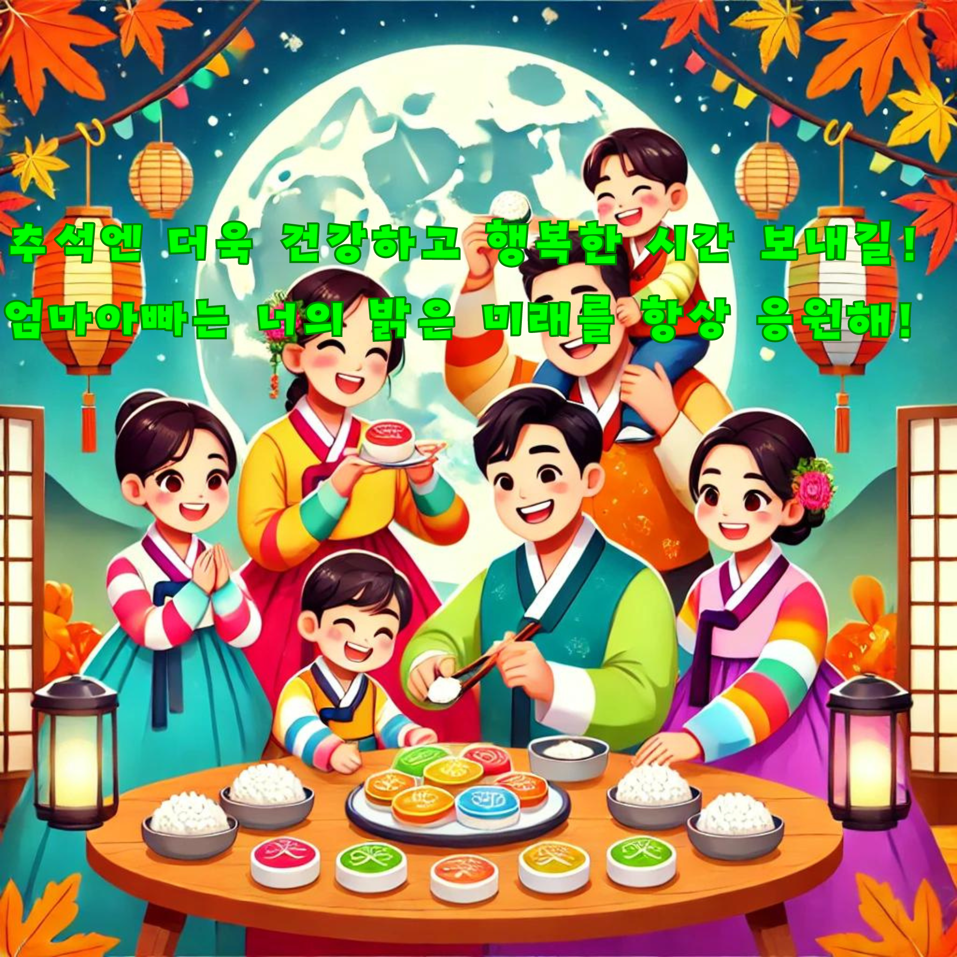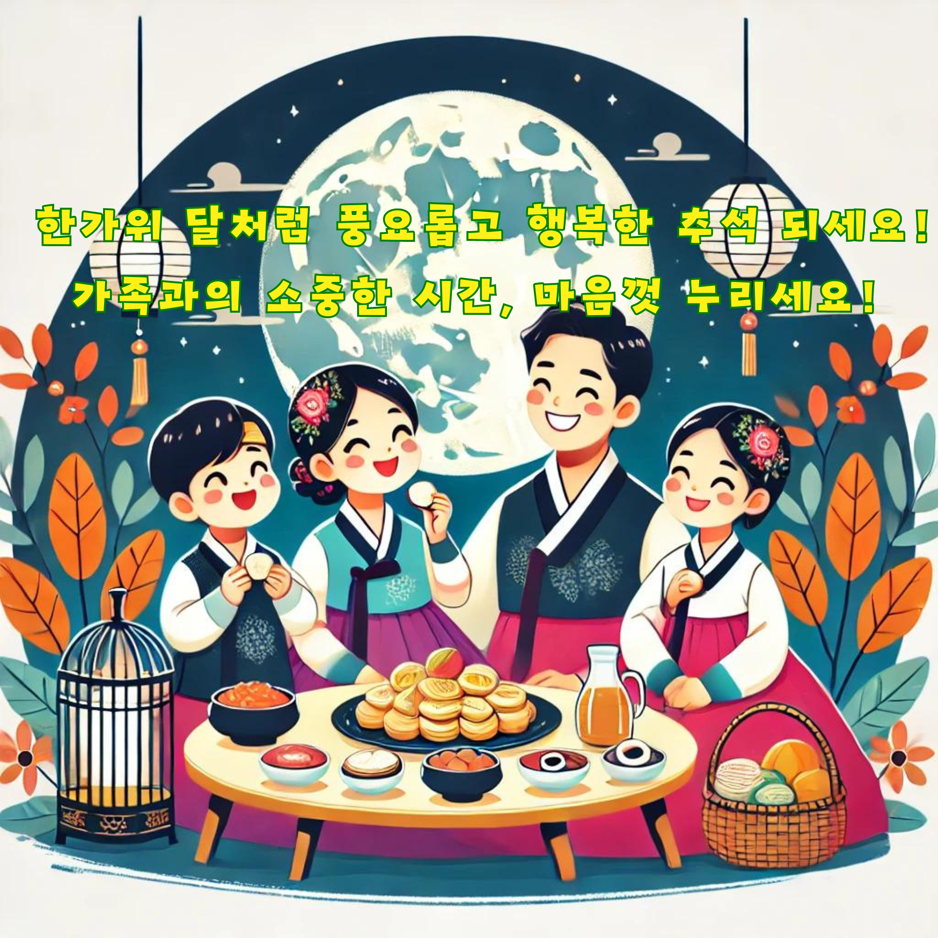 - 따뜻하고 사랑스러운 느낌을 담은 이미지, 가족의 행복과 사랑을 상징하는 그림, 한가위의 따뜻한 분위기를 전달하는 디자인