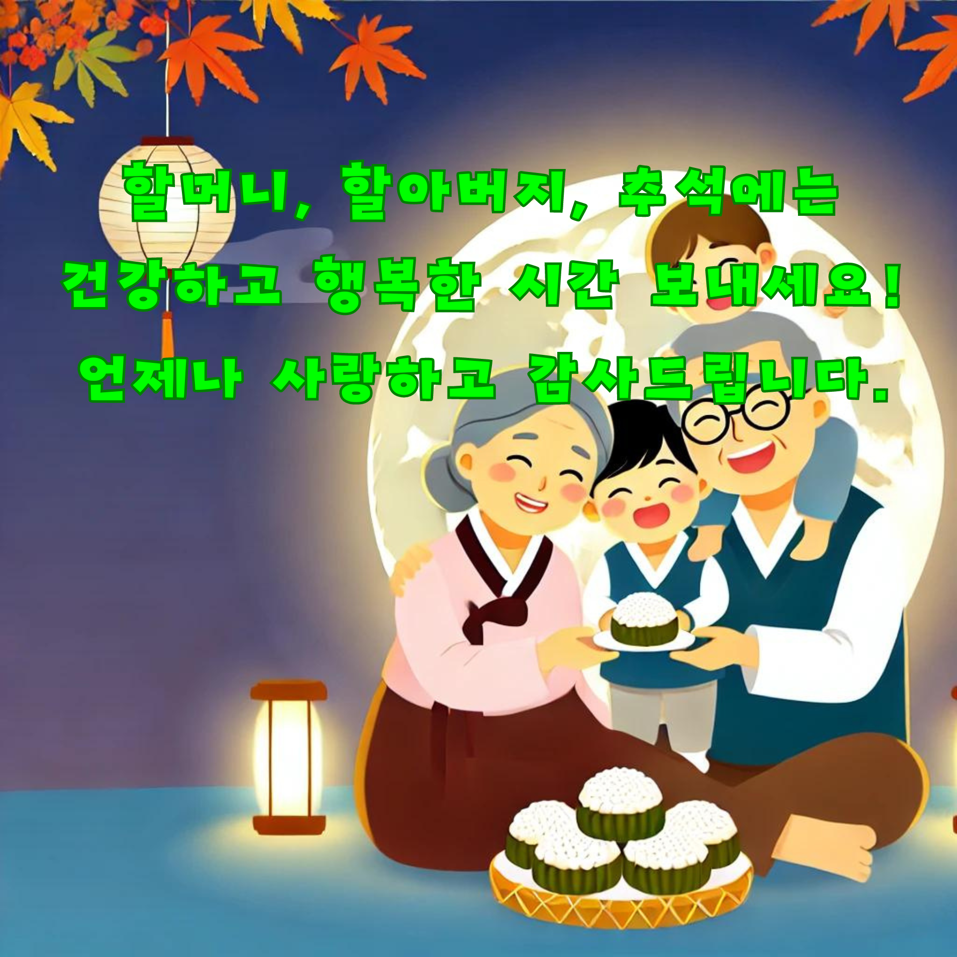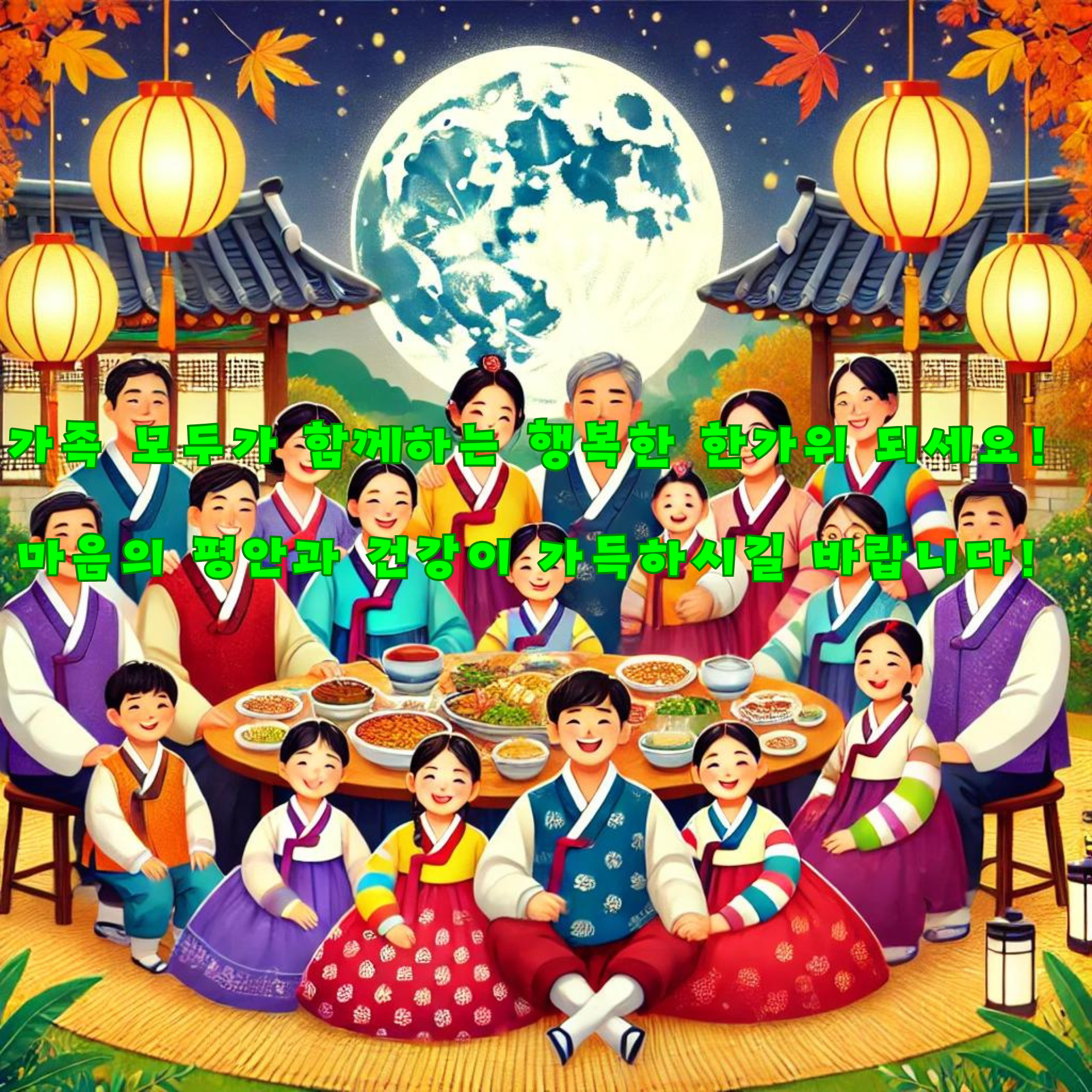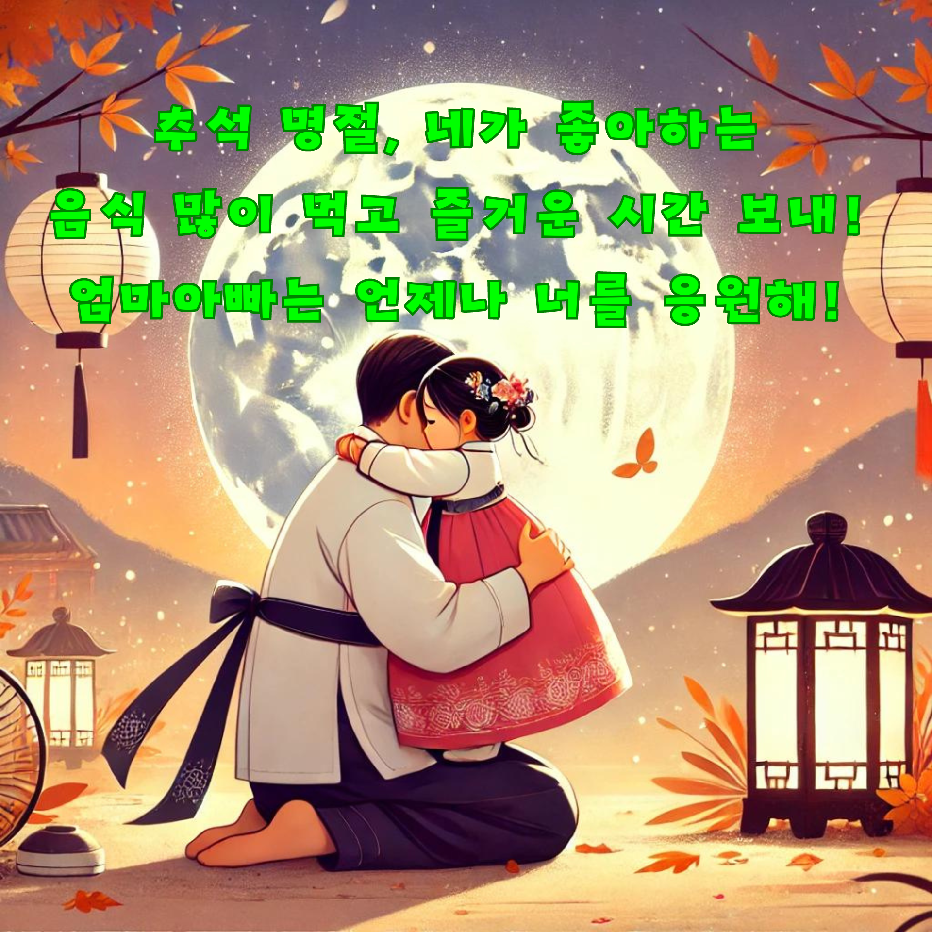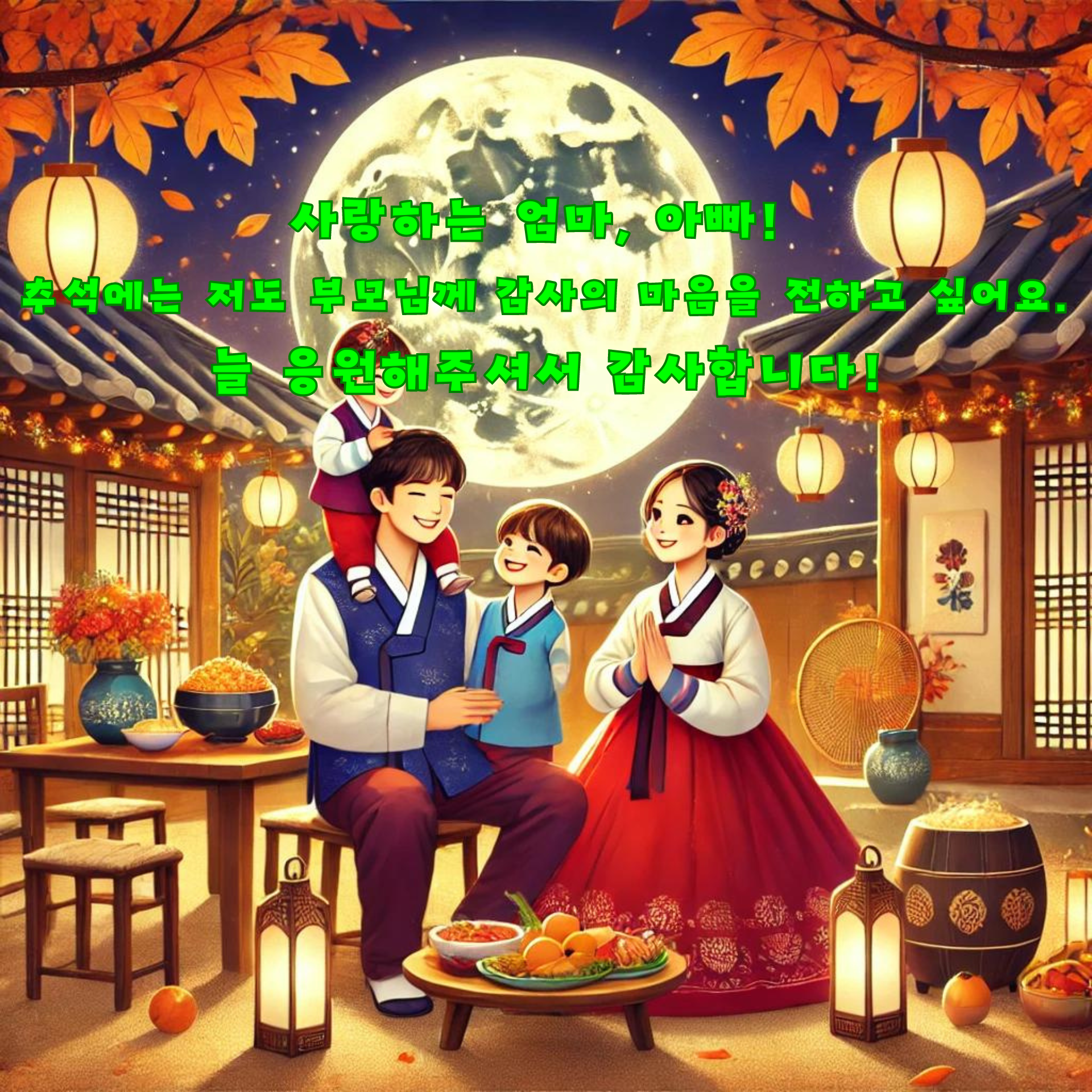 - 따뜻하고 사랑스러운 느낌을 담은 이미지, 가족의 행복과 사랑을 상징하는 그림, 한가위의 따뜻한 분위기를 전달하는 디자인