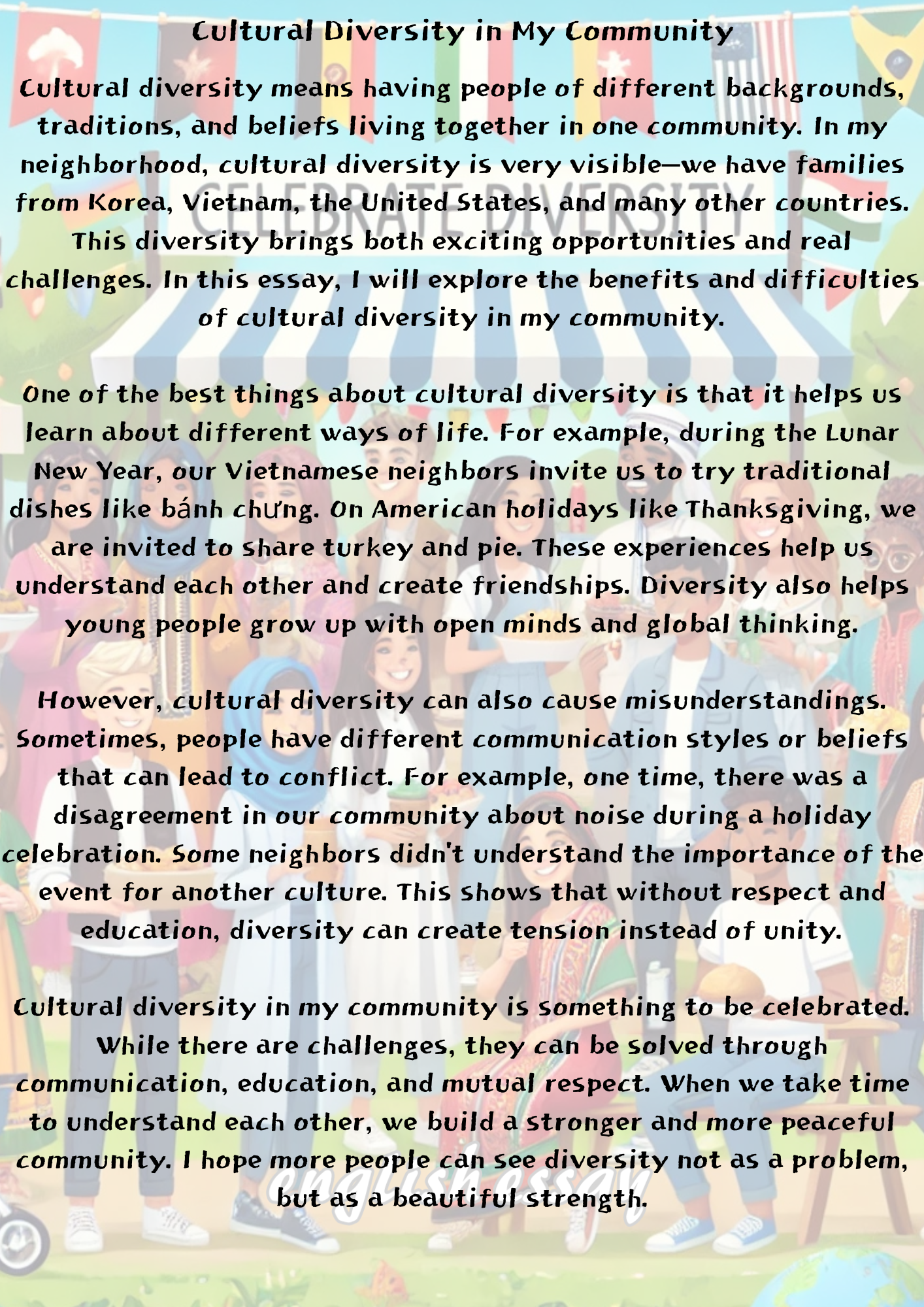 Cultural diversity means having people of different backgrounds, traditions, and beliefs living together in one community. In my neighborhood, cultural diversity is very visible—we have families from Korea, Vietnam, the United States, and many other countries. This diversity brings both exciting opportunities and real challenges. In this essay, I will explore the benefits and difficulties of cultural diversity in my community.