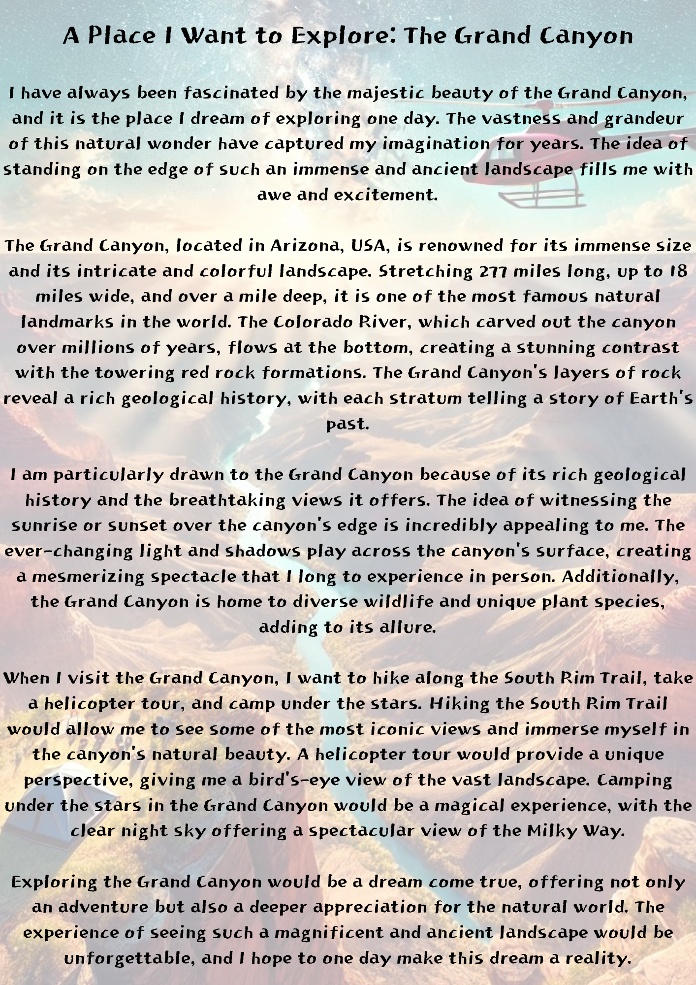 I have always been fascinated by the majestic beauty of the Grand Canyon, and it is the place I dream of exploring one day. The vastness and grandeur of this natural wonder have captured my imagination for years. The idea of standing on the edge of such an immense and ancient landscape fills me with awe and excitement.