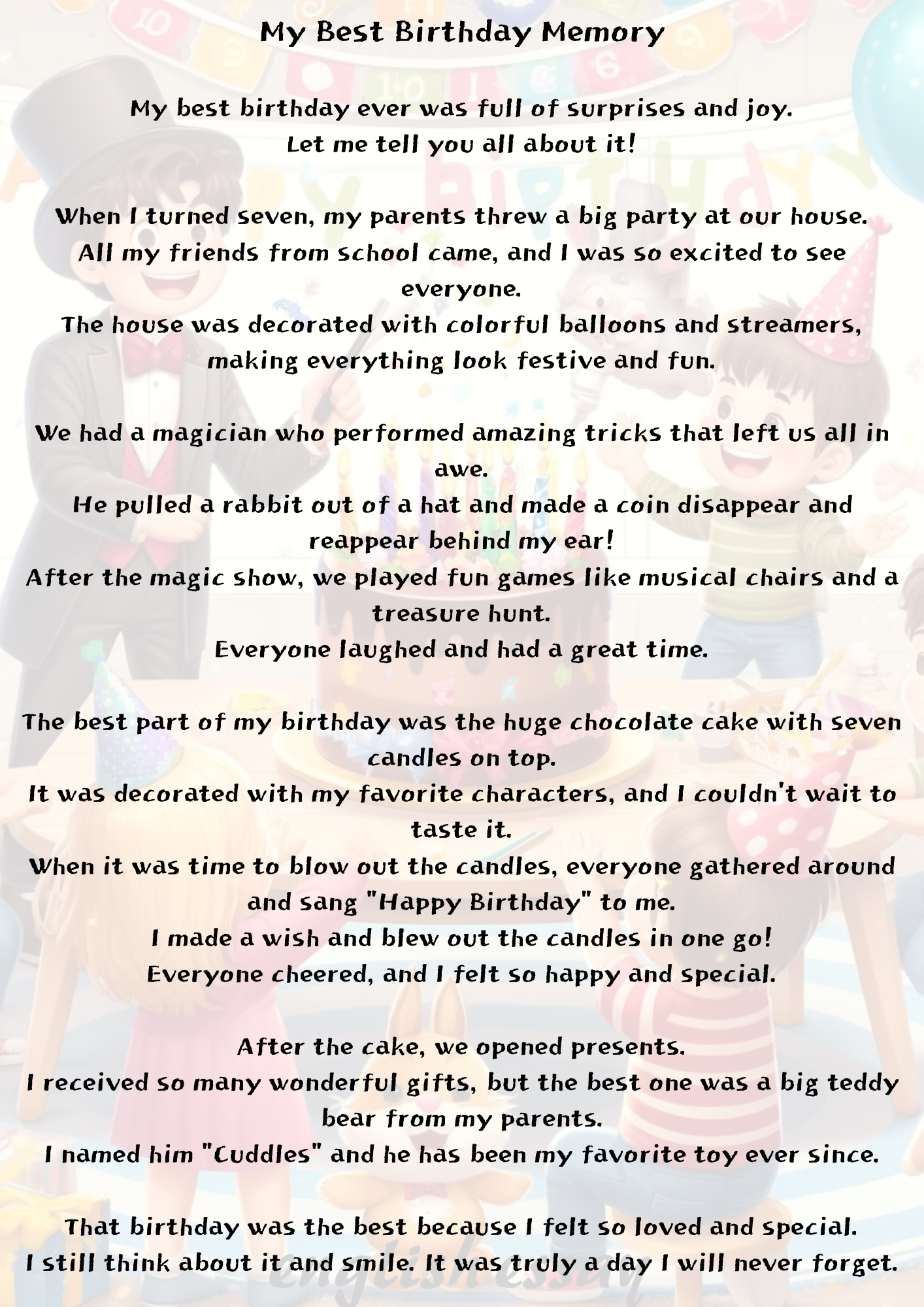 The best part of my birthday was the huge chocolate cake with seven candles on top.
